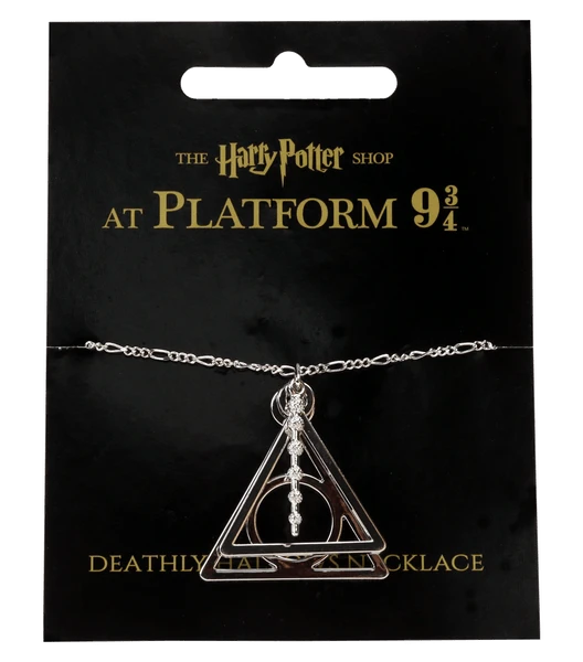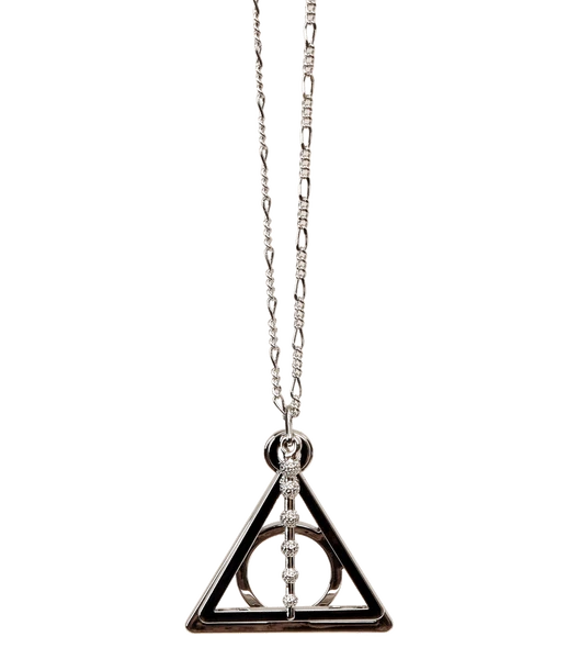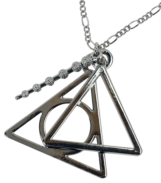 This triple-layered Deathly Hallows necklace encompasses all three symbols of the Deathly Hallows; the resurrection stone, the cloak of invisibility and a tiny replica of the Elder wand hanging in the centre. Each symbol is featured as a charm. Xenophilous Lovegood can be seen wearing a similar necklace in Harry Potter and the Deathly Hallows.
