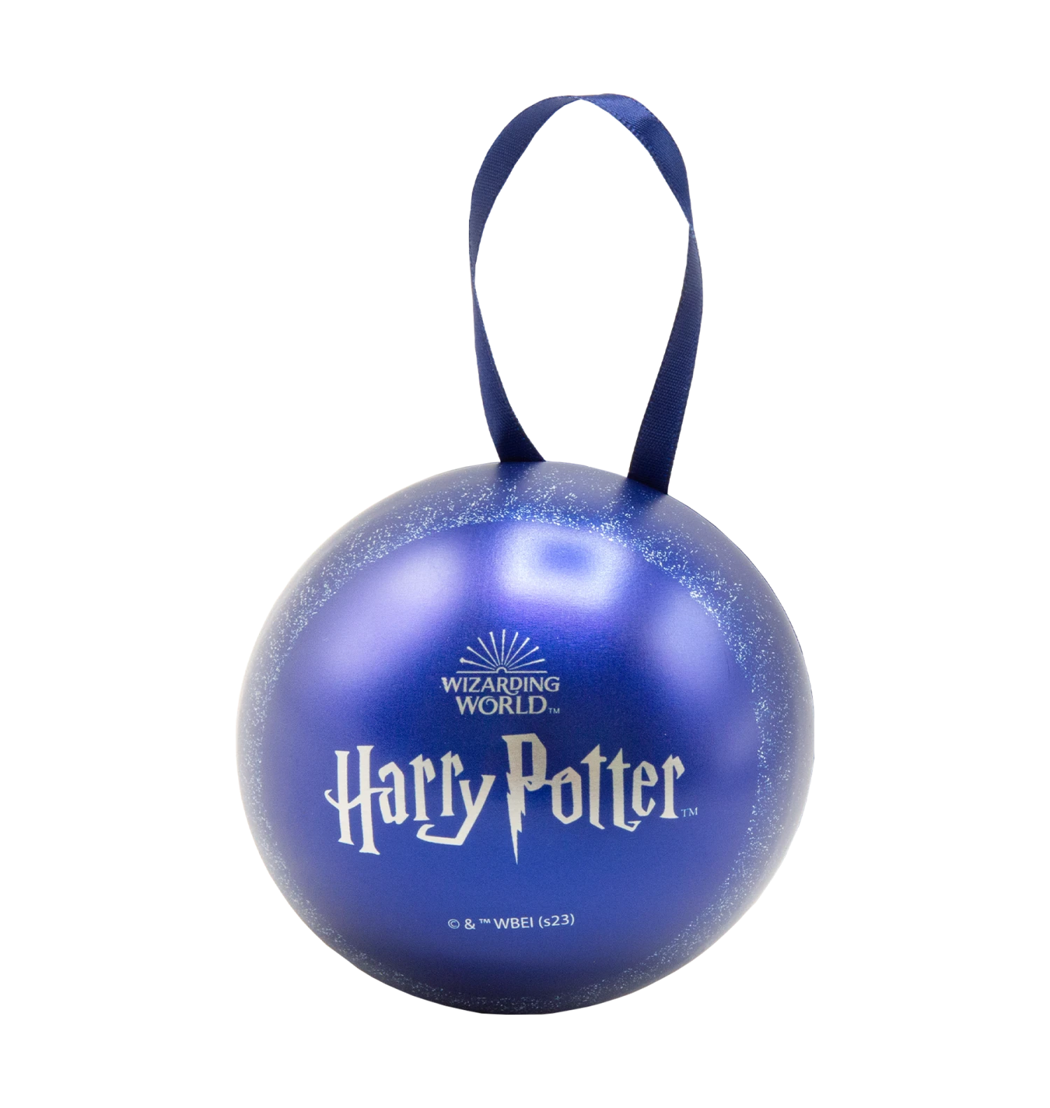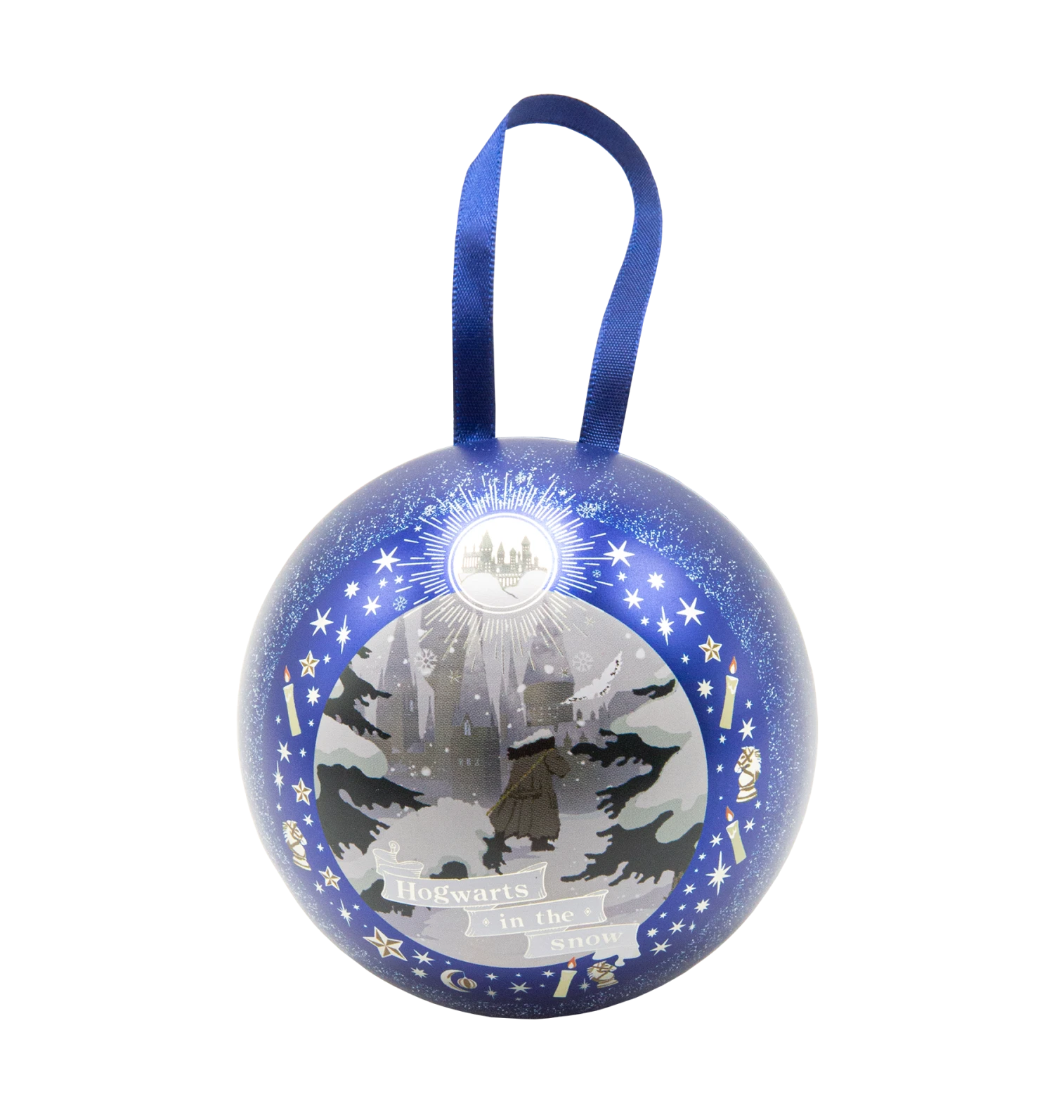 Crafted in a satin metallic navy tinplate, this decoration measures 8cm in diameter and features an iconic Christmas scene from the Philosopher’s Stone. Hagrid pulls a freshly cut fir tree through the snow outside Hogwarts Castle. Stars, candles, and snowflakes surround the illustrative design while a scrolling white banner reads “Hogwarts in the Snow.” Silver accents and glitter dust the edges, with the reverse side showcasing the Wizarding World logo and classic Harry Potter font.