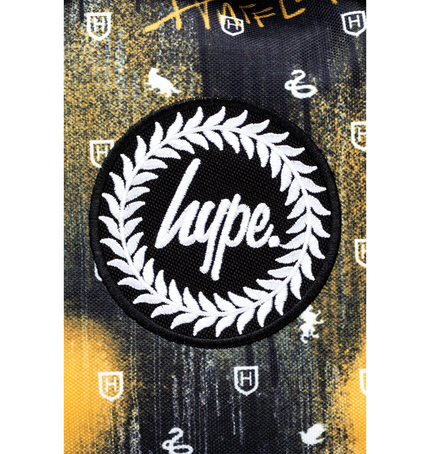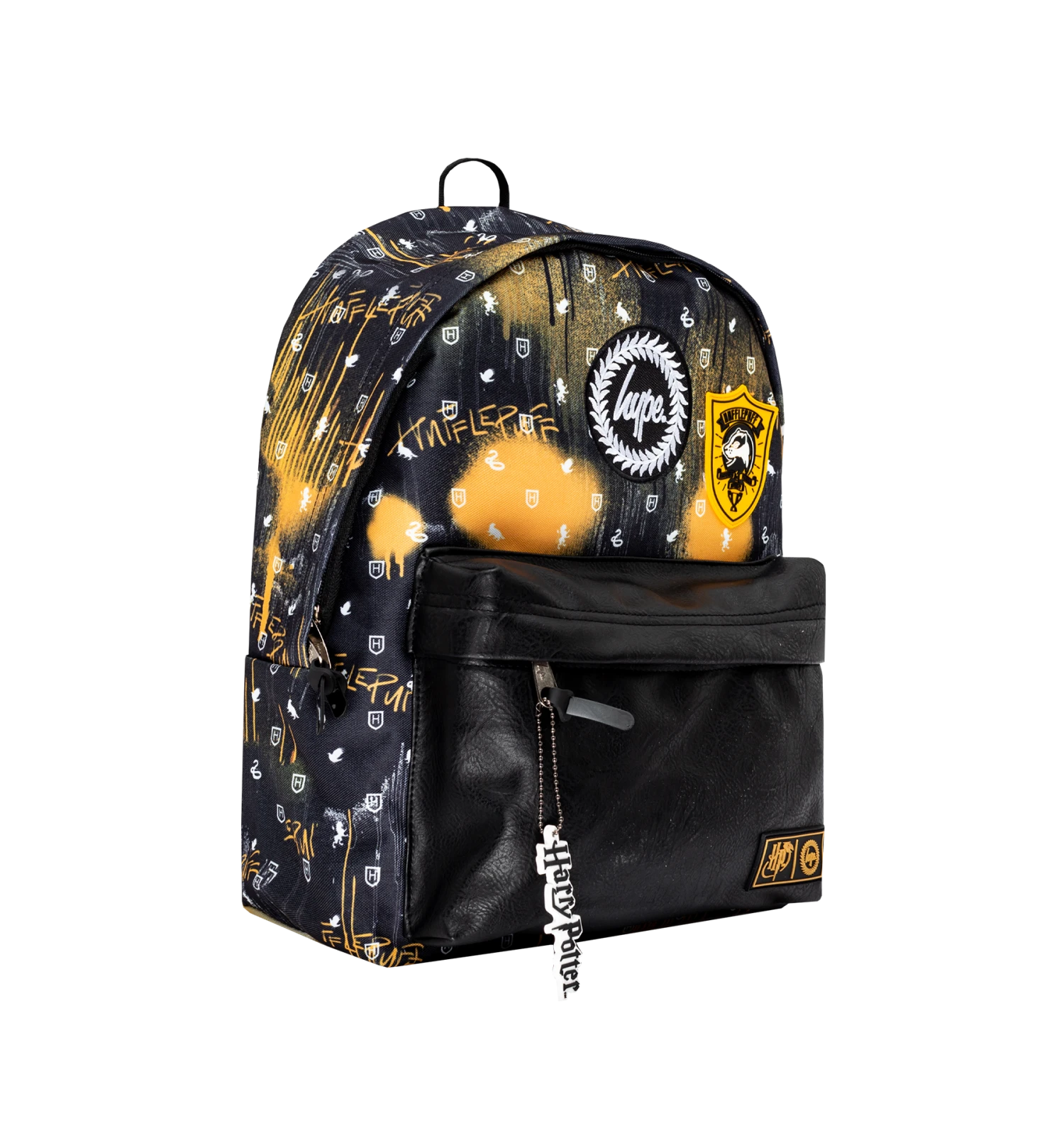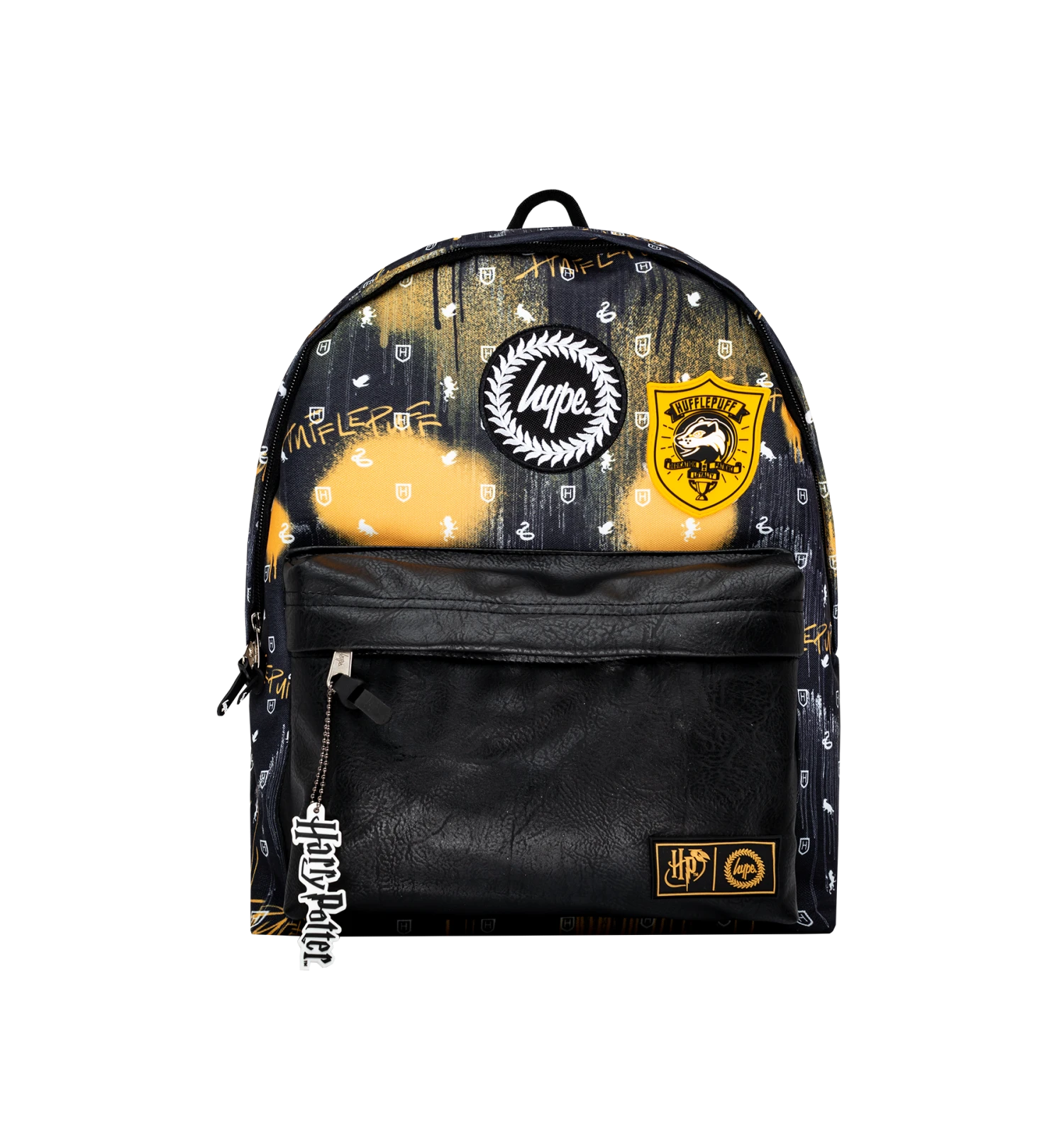 Featuring a Hufflepuff spray drip print in a black, white, and yellow colour palette and a black faux leather front pocket. Finished with a grab handle, front pocket, comfortable over-the-shoulder straps, a Harry Potter keychain, Hufflepuff crest, and the iconic HYPE. crest logo. Wipe clean only.