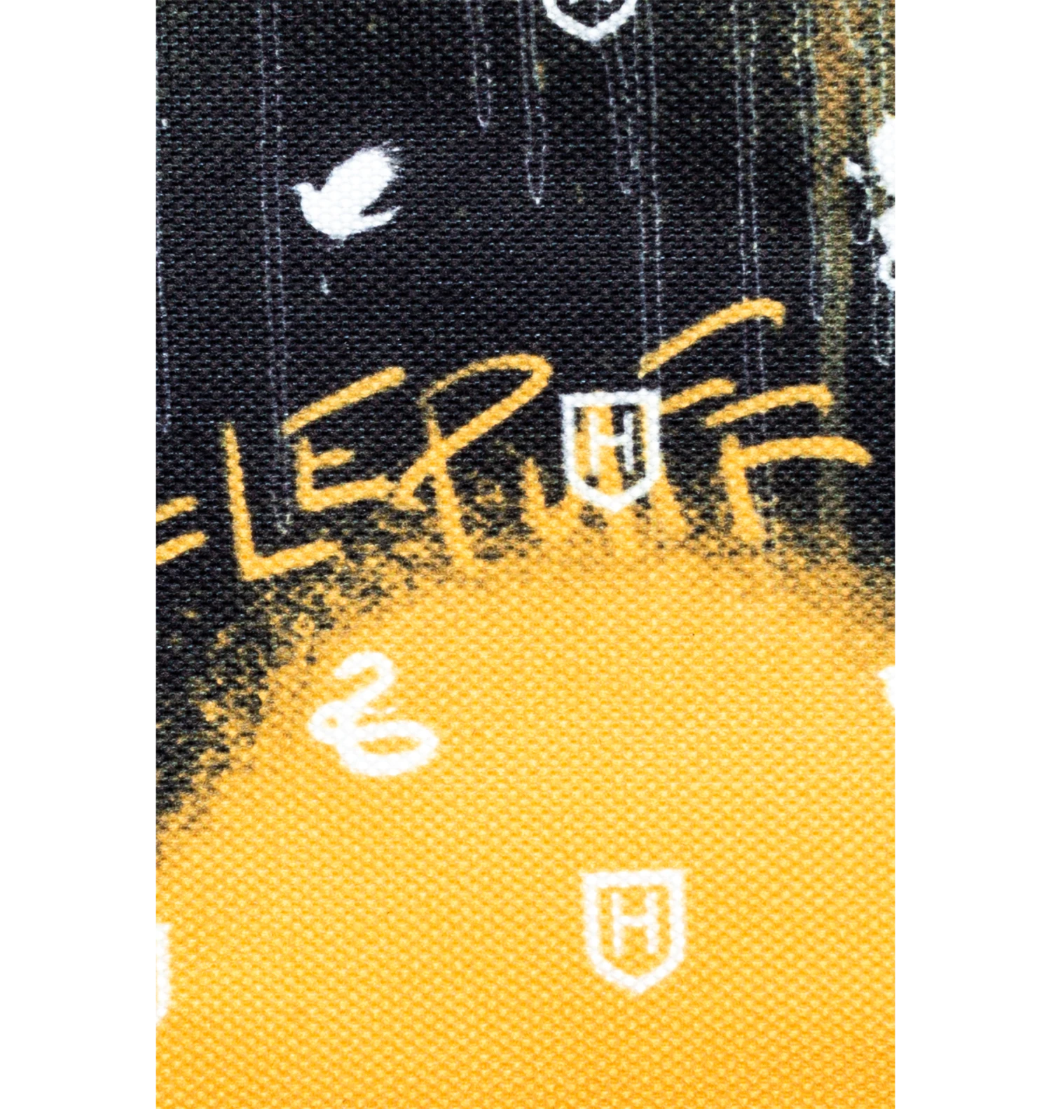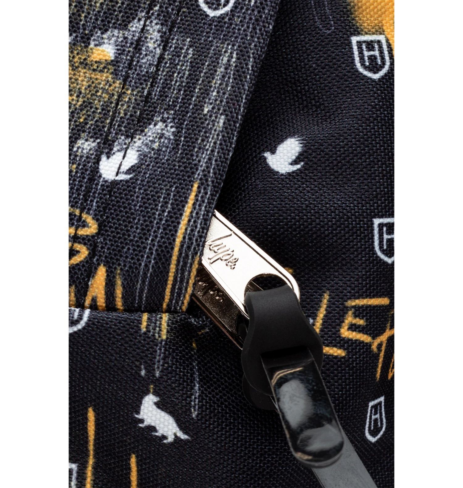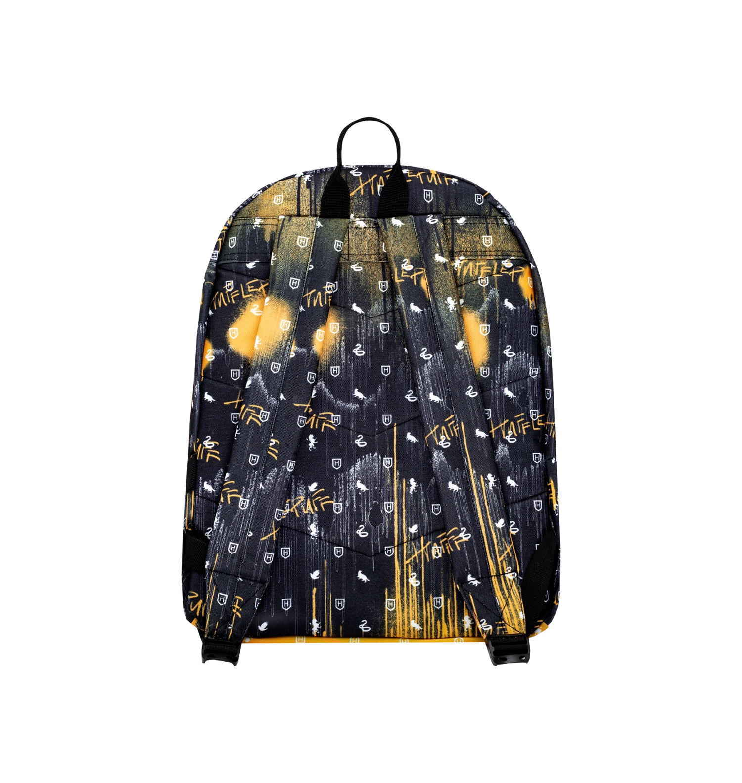 Featuring a Hufflepuff spray drip print in a black, white, and yellow colour palette and a black faux leather front pocket. Finished with a grab handle, front pocket, comfortable over-the-shoulder straps, a Harry Potter keychain, Hufflepuff crest, and the iconic HYPE. crest logo. Wipe clean only.