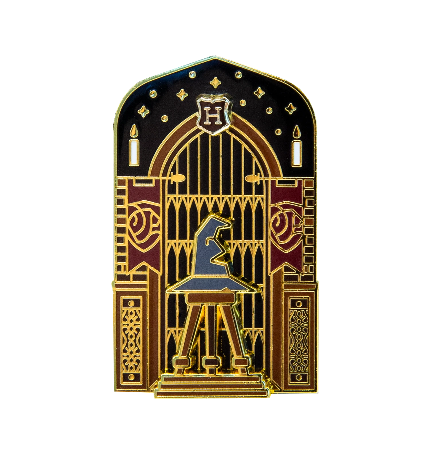 The Sorting Hat sits unassuming in the center of the Great Hall, ready to usher in a new year of aspiring Hogwarts students. Surrounded by candles and stars, each of the four Hogwarts house crests and colours can be seen framing the sides of the hall’s doors.