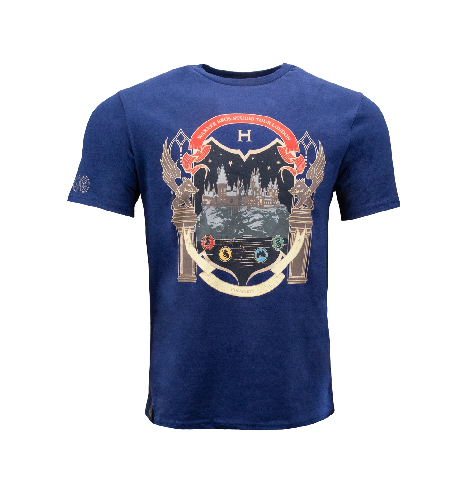 This vibrant navy-blue t-shirt is exclusive to the London Iconic Hogwarts collection and features a striking graphic illustration of Hogwarts School of Witchcraft and Wizardry in a picturesque view. Two decorative pillars representing the entry gates to Hogwarts are features in grey with a gold outline at each side of the design.