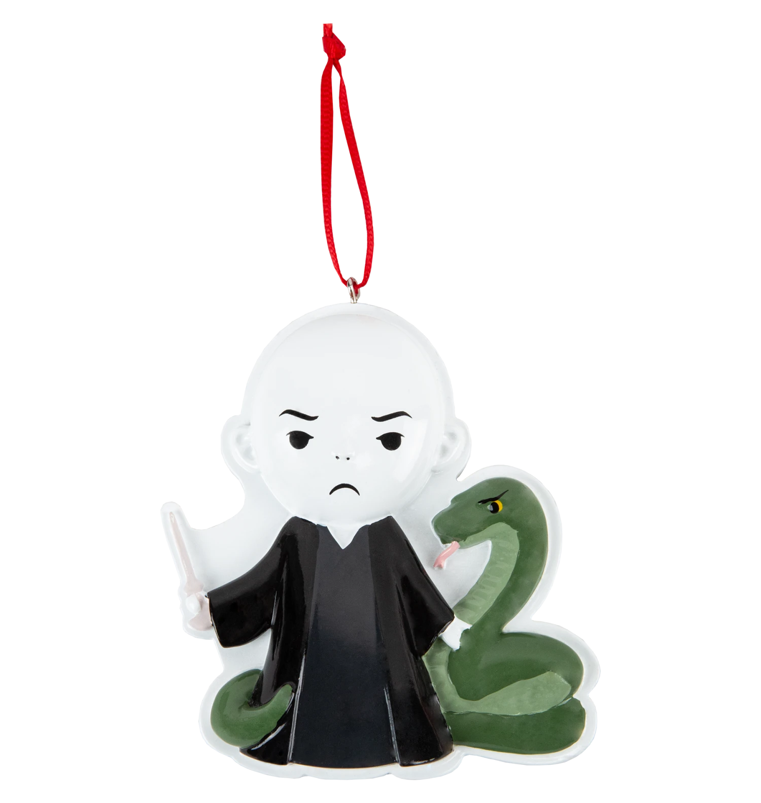 The darkest wizard of all time, Lord Voldemort is wearing a black robe and holding a wand in one hand, whilst a serpent surrounds him. The ornament, which is made of resin features a red ribbon attached through a hook for easy hanging through the festive season.