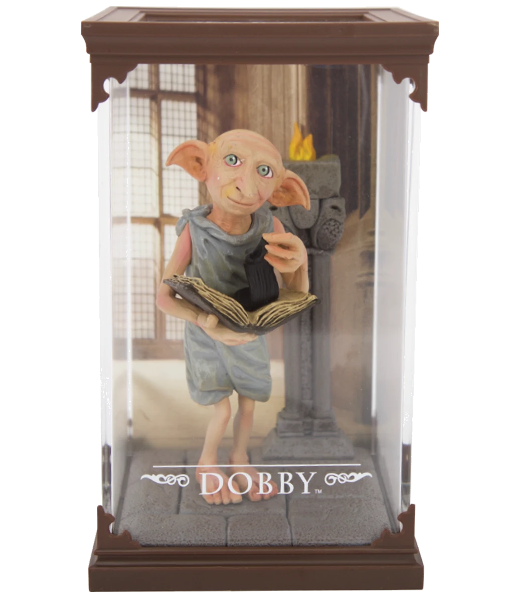 Intricately detailed and painted figurine of Dobby the House Elf. Each figure comes in its own display case. Case lid and creature are removable from base. Display case measures approximately 7 x 4.25 inches.