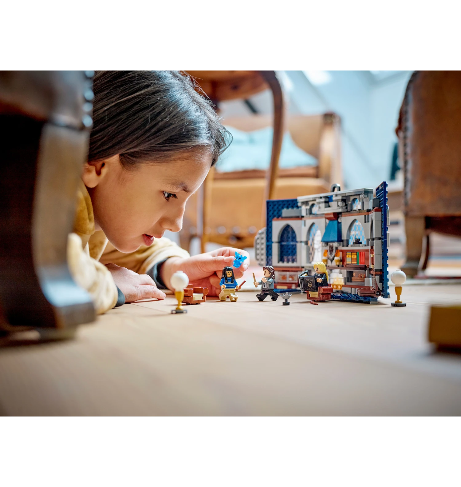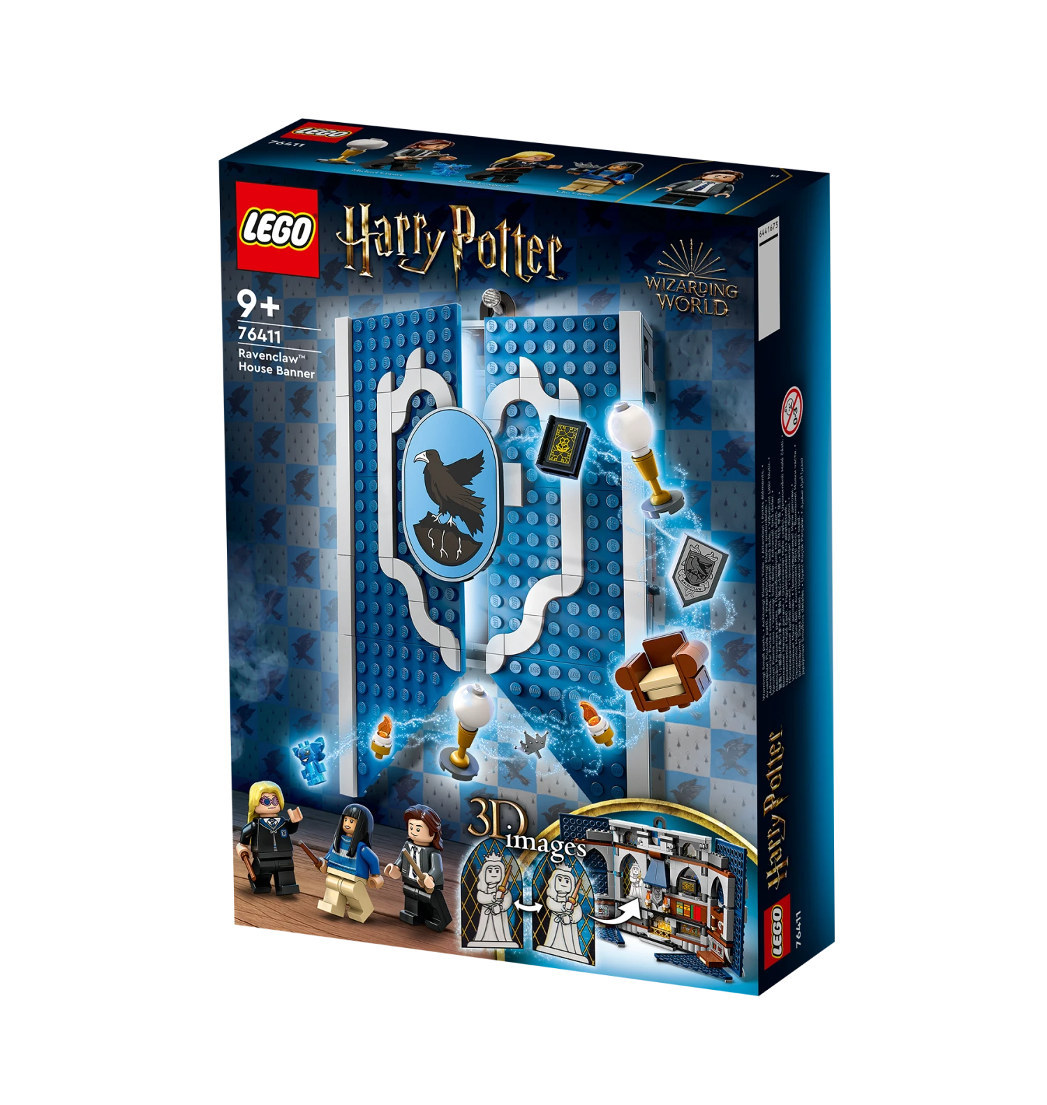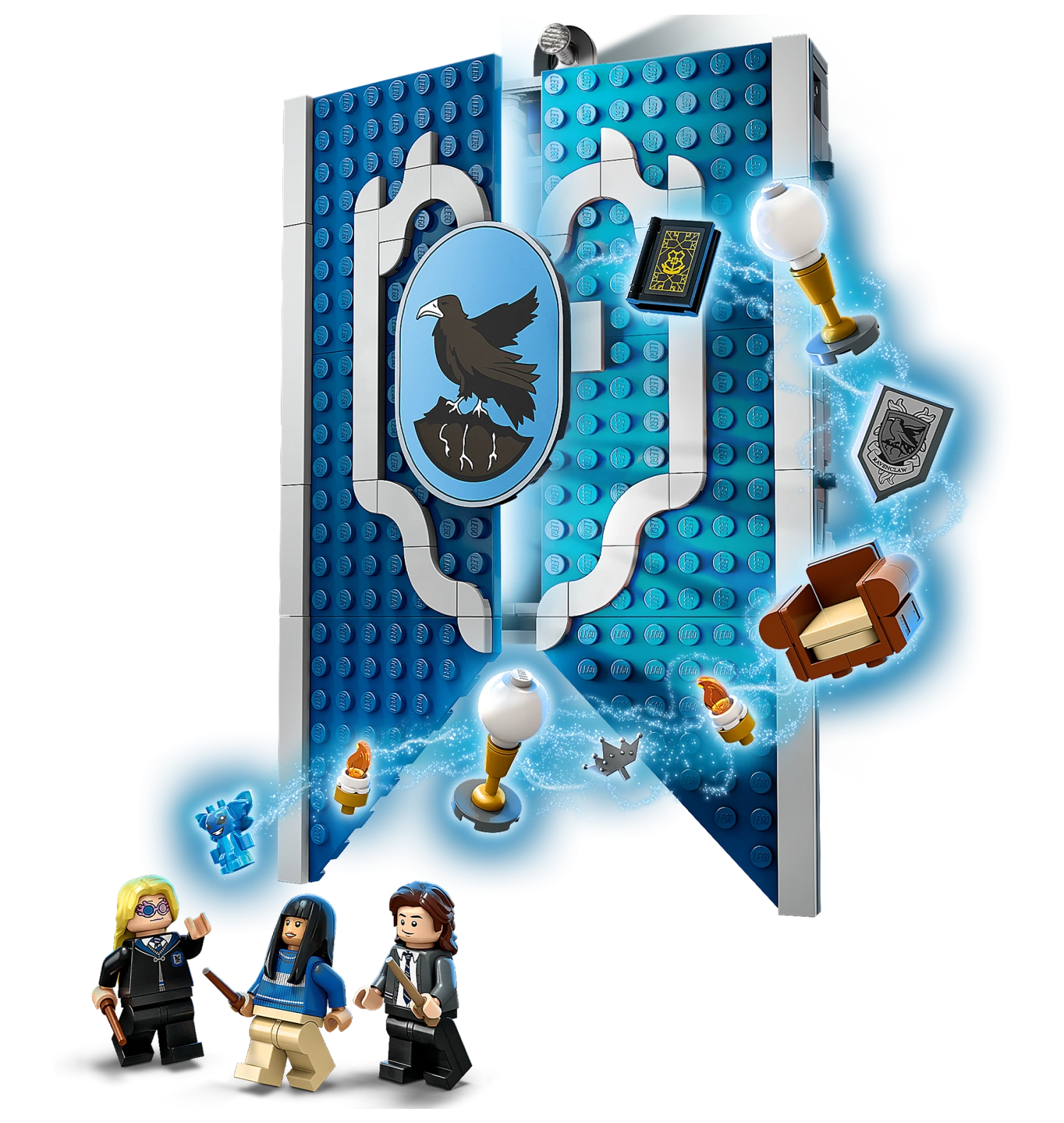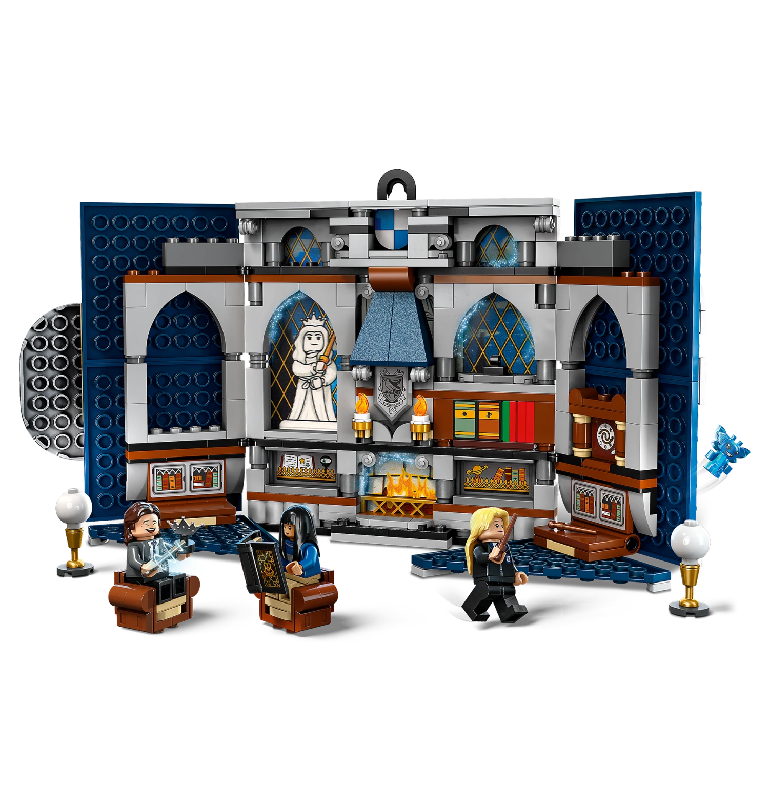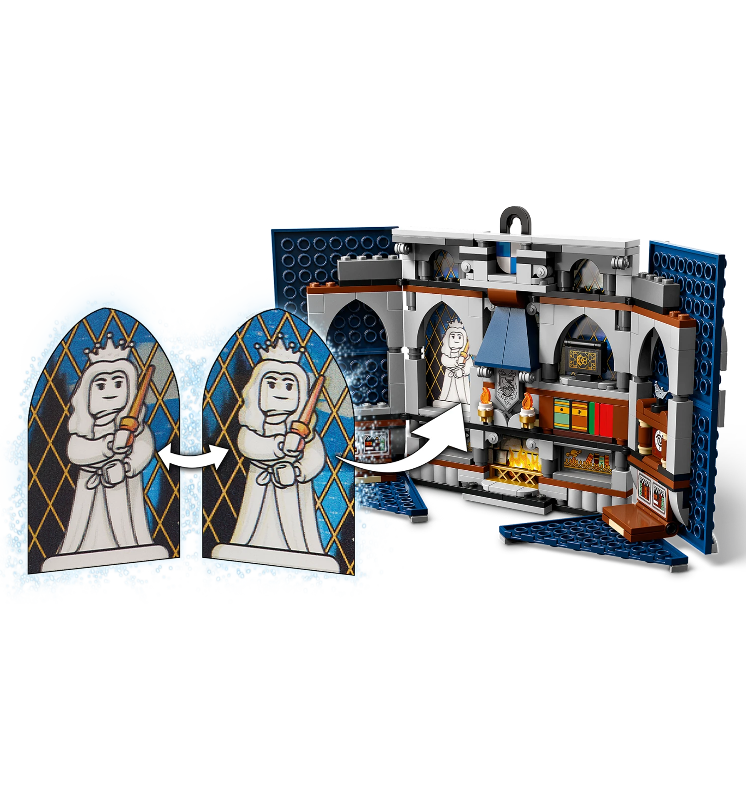 The LEGO Harry Potter playset features a printed tile with the Ravenclaw crest and a hanger to display it on the wall. The brick-built banner also opens to reveal a detailed recreation of the grand Ravenclaw common room with a table, book, 2 seats and 2 lamps, plus Ravenclaw’s Diadem. A slide-in lenticular backboard creates magical 3D effects, such as the illusion of depth through the windows and flickering flames in the fireplace.