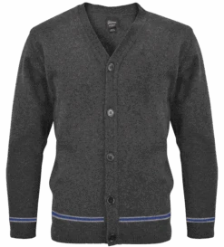 This charcoal V-neck Ravenclaw cardigan is knitted and assembled in the Scottish Mill that made the costumes for the cast and extras in the Harry Potter film series.